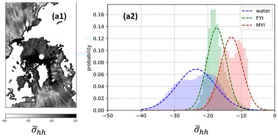 As for the second aspect, to differentiate between first-year ice and MYI, different training datasets have been used in previous studies [,]. For instance, in the OSI SAF sea ice type procedure, specific regions are defined as MYI and FYI []. In this study, sea ice concentration and SIA products released from NSIDC are used for prior information definition. Specifically, water is defined as the area with a sea ice concentration of less than 40% and SIA less than 1 year, and FYI is defined as the pixel where the sea ice concentration is higher than 40% and the SIA product is less than 1 year. MYI corresponds to pixels with a sea ice concentration higher than 40% and SIA older than 1 year. The advantage of applying 40% as the threshold is that most of marginal ice zone area can be excluded, where the backscatter coefficient of first-year ice appears to be similar to that of multi-year ice [,]. Furthermore, the training model is updated on the 1st and 15th of each month, the assessment of which will be described later.