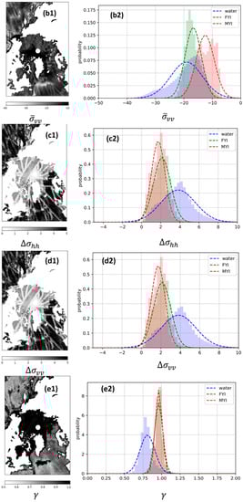 Parameters derived from one day of CSCAT measurements in the Arctic on April 2020. (a1) , (b1) , (c1) , (d1) and (e1) . Arctic images contain 448 × 304 pixels with a pixel resolution of 25 km. The central white circular area represents no observations. Density plot for parameters (a2) , (b2) , (c2) , (d2) , and (e2) for water (blue), FYI (green), and MYI (red).