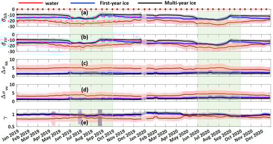 Figure 4 shows the statistical results of the sea ice type feature parameters based on the random forest classification during the period from 1 January 2019 to 31 December 2020. The red, blue, and black lines represent the mean values of the Gaussian distribution of feature parameters derived from the water, FYI, and MYI, respectively. The corresponding shaded part is the standard deviation of the Gaussian distribution. It can be seen that the feature parameters have obvious differences except for June, July, August, and September of each year. The corresponding date of the model update is represented by red solid dots shown in Figure 4a, that is, the 1st and 15th of each month. Specifically, the model on the 1st day of each month is used for sea ice classification from the 2nd to 15th day of the current month, and the model on the 15th day of each month is used for sea ice classification from the 16th day of the current month to the 1st day of the next month. This model updating frequency setting can reasonably represent the difference in feature parameters. Additionally, it can effectively reduce the impact of prior information fluctuations on the results and ensure the stability of the results.
