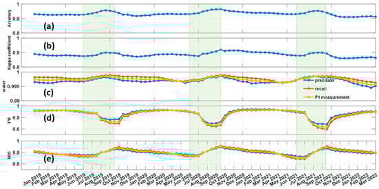 The time series of the evaluation parameters of the sea ice type training model in the Arctic from 1 January 2019 through 1 March 2020 for (a) accuracy, (b) kappa coefficient, (c) water, (d) FYI, and (e) MYI.
