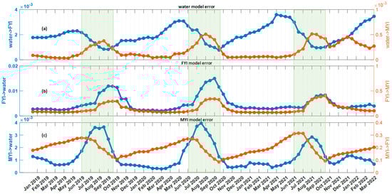 In addition, the identification accuracy of FYI, as shown in Figure 5d, has obvious seasonal characteristics, with a significant decrease from June to September of each year. Combined with the results in Figure 4, it can be seen that the feature parameters of FYI and MYI are almost the same and cannot be distinguished very well from June to September of each year, resulting in a higher tendency to be misclassified. Correspondingly, the FYI is easily misclassified as MYI at the end of the summer and during the whole autumn season, as shown in Figure 6b. On the contrary, as shown in Figure 5e, the identification accuracy of MYI from June to September of each year is higher than that in other months. This is likely related to the prior information we use in this study. Generally, the NSIDC SIA product is more conservative in the identification of MYI, which means that more pixels are classified as MYI, resulting in the MYI model error characteristics shown in Figure 6c.