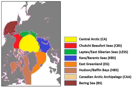In order to analyze the spatial characteristics of the Arctic sea ice in more detail, eight subregions that are consistent with previous studies are defined, as shown in Figure 7 [,]. The eight subregions include the central Arctic (CA), Chukchi Sea/Beaufort Sea (CBS), Laptev Sea/East Siberian Sea (LESS), Kara Sea/Barents Sea (KBS), East Greenland (EG), Hudson Bay/Baffin Bay (HBS), Canadian Arctic Archipelago (CAA), and Bering Sea (BS).