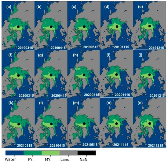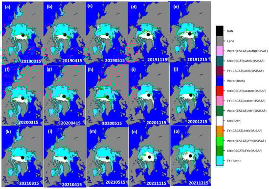 Spatial distribution of sea ice types on (a) 15 March 2019, (b) 15 April 2019, (c) 15 May 2019, (d) 15 November 2019, (e) 15 December 2019, (f) 15 March 2020, (g) 15 April 2020, (h) 15 May 2020, (i) 15 November 2020, (j) 15 December 2020, (k) 15 March 2021, (l) 15 April 2021, (m) 15 May 2021, (n) 15 November 2021, and (o) 15 December 2021.