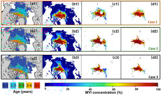 The spatial distribution of the NSIDC weekly SIA product (a1) from 12 November 2019 to 18 November 2019, (a2) from 12 February 2020 to 18 February 2020, and (a3) from 15 April 2020 to 21 April 2020. The spatial distribution of IUP daily MYIC on (b1) 15 November 2019, (b2) 14 February 2020, and (b3) 15 April 2020. The corresponding spatial distribution of IUP MYIC marked as CSCAT MYI pixels and OSI SAF MYI pixels on three selected days are shown in (c1–c3), and (d1–d3), respectively.
