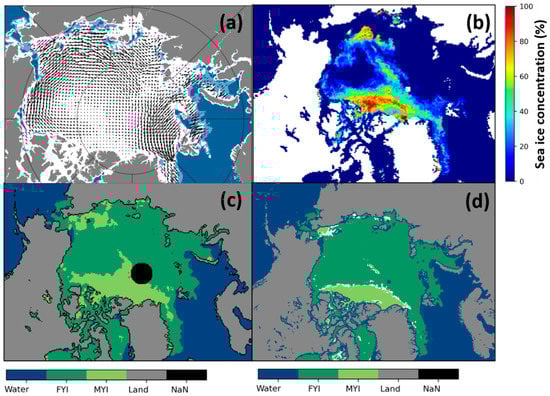 The spatial distribution of (a) LR sea ice drift from 13 May 2020 to 15 May 2020, (b) IUP daily MYIC on 15 May 2020, (c) CSCAT sea ice type on 15 May 2020, and (d) OSI SAF sea ice type on 15 May 2020.