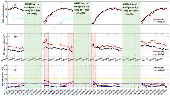 Time series of (a) FYI extent and (b) MYI extent derived from CSCAT (red line) and OSI SAF (black line), respectively. MYI monthly standard deviations (STD) derived from CSCAT (red dotted line) and OSI SAF (black dotted line) are shown in (c).