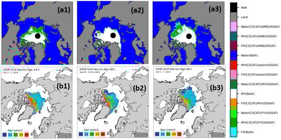 Furthermore, it can be seen from Figure 12a that the CSCAT FYI extent in October 2019 and October 2021 is significantly less than that of the OSI SAF sea ice type product, and corresponding to Figure 12b, the CSCAT MYI extent is much higher than that of OSI SAF MYI in this time period. A comparison with the weekly SIA product is made to further analyze this phenomenon, as shown in Figure 13. Specifically, Figure 13(a1–a3) show the spatial distribution difference between the CSCAT results and the OSI SAF sea ice type products on the first day of the end of OSI SAF ambiguous ice in 2019–2021, that is, 4 October 2019, 1 October 2020, and 1 October 2021, respectively. The weekly SIA corresponding to the three dates are shown in Figure 13(b1–b3), respectively. It can be seen from Figure 13(a1,a3) that on the two days of 4 October 2019 and 1 October 2021, in the CA area, the area determined as FYI by OSI SAF was identified as MYI by CSCAT. During the two one-week periods from 1 October 2019 to 7 October 2019, and from 1 October 2021 to 7 October 2021, as shown in Figure 13(b1,b3), almost all the sea ice was identified as MYI by the SIA product. This indicates that the OSI SAF sea ice type product underestimates the extent of MYI in these cases, and compared with the OSI SAF sea ice type product, CSCAT can better describe the distribution of sea ice type at the initial stage of the freezing-up period.