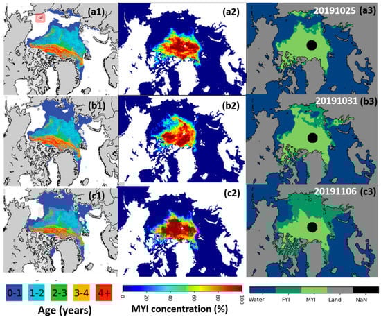 The spatial distributions of NSIDC weekly SIA product (a1) from 22 October 2019 to 28 October 2019, (a2) from 29 October 2019 to 4 November 2019, and (a3) from 5 November 2019 to 11 November 2019. The spatial distribution of IUP daily MYIC on (b1) 25 October 2019, (b2) 31 October 2019, and (b3) 6 November 2019. The corresponding spatial distribution of CSCAT sea ice type on (c1) 25 October 2019, (c2) 31 October 2019, and (c3) 6 November 2019.