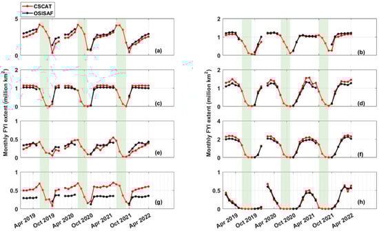 In the HBB region, as shown in Figure 15f, the FYI extent shows a gradually increasing trend from October to March of the next year. The MYI in this region should be rather limited, and the MYI overestimation from CSCAT is due to the poor quality of CSCAT L2A, which should be noted in further analysis. In the CAA region, as shown in Figure 15g and Figure 16g, both FYI and MYI maintain a stable extent from November to March of the next year. Obviously, the MYI extent from CSCAT is much higher than that from OSI SAF sea ice type in the CAA region. Considering the data from the BS region, as shown in Figure 15h and Figure 16h, FYI increases from October to February of the next year, and then decreases continuously. During the OSI SAF ambiguous ice period, the FYI extent from CSCAT is almost zero. Similar to the HBB region, the MYI in the BS region should be rather limited, the MYI overestimation from CSCAT is due to the poor quality of CSCAT L2A, which should be noted in further analysis.