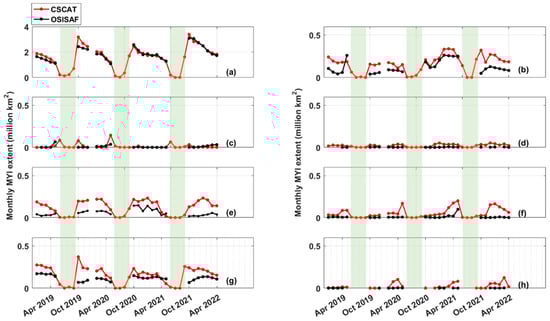 The monthly mean FYI and MYI extent derived from the CSCAT and OSI SAF sea ice type products in eight subregions are shown in Figure 15 and Figure 16, respectively. In the CA region, as shown in Figure 15a, the FYI extent and change trend of CSCAT and OSI SAF are very consistent with each other, both showing a continuous increasing trend from October to May of the next year. Overall, the FYI extent derived from OSI SAF is larger than that of CSCAT. CSCAT also provides results in the period when OSI SAF identified ambiguous ice. It can be seen that the FYI extent reached the maximum in June and then decreased to October. As for the MYI extent in the CA region, as shown in Figure 16a, both the CSCAT results and OSI SAF sea ice type product show a continuous decreasing trend from October to May of the next year, and the MYI extent derived from CSCAT is larger than that of OSI SAF sea ice type. From June to August, there was almost no MYI shown in the CSCAT results, but the MYI extent increased in September. Specifically, in middle and late September of each year, CSCAT determined most of the sea ice as MYI, and the prediction accuracy is quite high, as shown in Figure 5 and Figure 6. This indicates that the CSCAT results have a better representation even in the period when the OSI SAF sea ice type is classed as ambiguous.