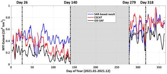 In order to use high-resolution products to validate our results from a long-term period, the SAR-based sea ice type products in Sentinel-1 SAR data using a convolutional neural networks (CNN) algorithm released by CMEMS are used in this study. Figure 17 shows the time series of a three-day moving average MYI extent derived from SAR-based sea ice type, CSCAT, and OSI SAF sea ice type over the region covered by SAR images all-year round during 2021. The grey-shaded area represents the time period with an ambiguous ice type classification from the OSI SAF sea ice type product. Good consistency in the trend from these three results can be seen in Figure 17. The correlation coefficient of SAR and the CSCAT result, and SAR and the OSI SAF are 0.74 and 0.73, respectively. Additionally, the correlation coefficient for the CSCAT and OSI SAF results is up to 0.96. The averaged MYI extents in the analyzed period derived from SAR, CSCAT, and OSI SAF are 5.12 × 105, 4.69 × 105 and 2.89 × 105 km2, respectively. During the period from Day 26 to Day 140, the MYI extents derived from SAR are much higher than the other two results, whereas in the Day 279–Day 318 period, the MYI extent from CSCAT is the largest compared with the other two results. From Day 318 to the end of 2021, the MYI extents from CSCAT have quite good consistency with those of SAR.