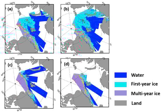 In order to validate CSCAT sea ice classification results using SAR products from a long-term perspective, the SAR-based sea ice type products provided by Copernicus Marine Environment Monitoring Service (CMEMS) from 1 January 2021 to 31 December 2021 are used in this study (https://resources.marine.copernicus.eu/product-detail/SEAICE_ARC_PHY_AUTO_L4_NRT_011_015/DATA-ACCESS, accessed on 20 Febuary 2023). This high-resolution operational sea ice type is derived from Sentinel-1 SAR data using a convolutional neural network (CNN) []. Validation shows that the overall accuracy exceeds 90% and has proved to be more efficient in computing time and less sensitive to noise in SAR data. In this algorithm, the prior information comes from reference ice charts produced by human experts. The SAR-based sea ice type provides pixel-by-pixel classification of SAR data into four different types, that is, water, young ice, FYI, and MYI. The young ice and FYI are grouped as FYI in this study.