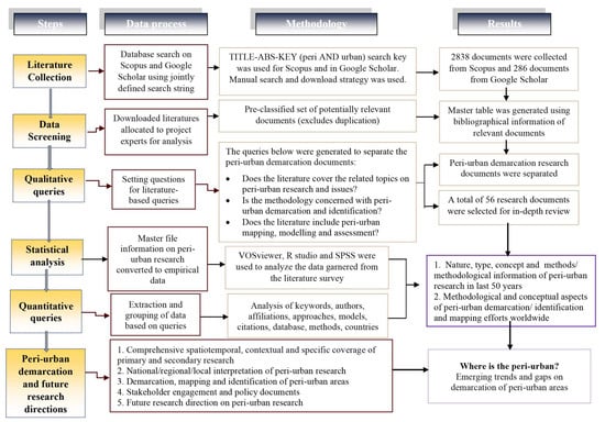 The present study employs a quantitative review of the Scopus and Google Scholar databases and a qualitative review of some specifically selected research documents. In the first step, Scopus and Google Scholar search engines were used to systematically identify peri-urban research published between 1967 and 2022. We used a search string focusing on the word peri-urban in the document title, abstract, and/or keywords. Two different search strings queries were used for this purpose, as denoted below: