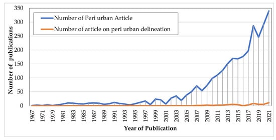 Among the 3124 documents published between 1967 to 2022 that dealt with peri-urban research, till 1990, only 56 publications had examined the demarcation of peri-urban areas (Figure 2), and most of these had focused on urban fringe development in European countries or the US. From 1991–2000, 114 publications had analysed peri-urban issues, but these had also largely focused on locales in developed nations.