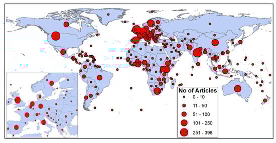 In terms of author affiliations and number of articles, the US (398 documents) and UK (309) take the lead in carrying out peri-urban research (Figure 4), followed by India (264), South Africa (223), Australia (213), and China (208). However, publication dates and author affiliations reveal that in recent decades, a greater volume of research has emanated from developing countries. This surmise tallies with the nature and rate of urbanization and peri-urban growth globally [35], which was considerable during 1970–1990 in developed countries, but thereafter became more pronounced in developing nations, particularly after the year 2000. Consequently, it is these developing nations that presently face the bulk of different socio-environmental-economic issues that arise out of city expansion and peri-urban growth, as highlighted by the recent literature.