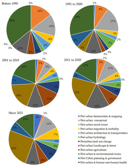 Peri-urban research received greater impetus in the new millennium due to the spurt in rapid urbanization and sprawl of large cities in developing nations, and the concomitant manifestation of its related environmental and socioeconomic problems. With rural to urban migration becoming commonplace in developing countries, its cities grew markedly and swiftly into the surrounding peri-urban areas. Between 2001–2010, over 470 published documents dealt with peri-urban issues, while in the last 12 years (2011–2022), this has surmounted to 2263 publications. Interestingly, most of these newer documents highlight peri-urban issues in developing countries, in contrast to the researches done before 2001.