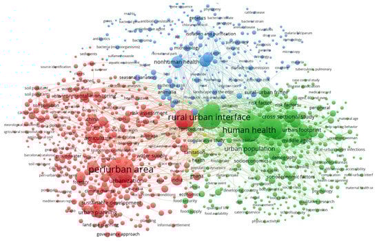 Bibliometric map of keywords co-occurrence with network visualization from 3124 documents on peri-urban studies. (Note: A bigger circle indicates greater occurrence of that keyword while a smaller one indicates lesser examined ideas/concepts. The colours red, green, and blue depict the three major clusters in such research, i.e., peri-urban area, rural–urban interface, and human and non-human health, respectively, and the coloured lines indicate interlinkages between the sub-components of each cluster).