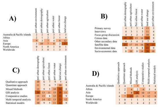 (A) Perspectives of peri-urban demarcation in different geographic regions, (B) Perspectives of peri-urban demarcation and the databases used, (C) Methods related to targeted peri-urban applications, and (D) Approaches used to demarcate peri-urban areas in different regions.