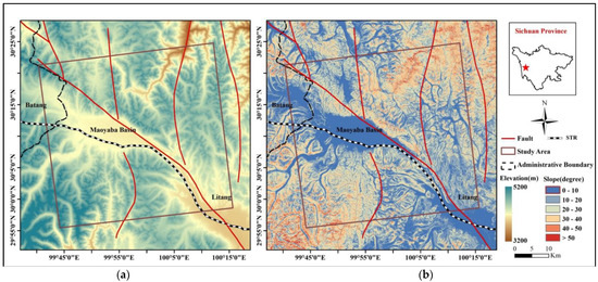 As shown in Figure 1, the study area is located in the west of Sichuan Province, China. The length of the STR in the study area is 60 km. The topography of the study area is mainly mountains and basins. The STR passes through the Maoyaba Basin. The study area is situated at a minimum altitude of 3600 m and a maximum altitude of 5600 m, with a relative height difference of 2000 m and slope distribution of 0–40°. Rainfall is mainly concentrated in June–September, with an annual precipitation of approximately 720 mm.
