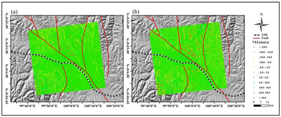 Displacement rates in the study area: (a) ascending orbit results and (b) descending orbit results.