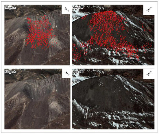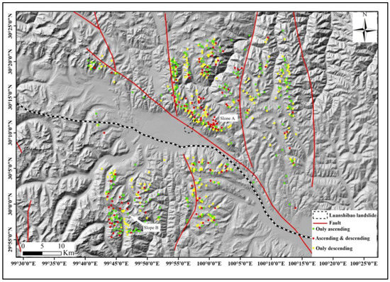 By combining the topographic visibility results of the ascending and descending orbits in Figure 6, a total of 377 unstable slopes were identified for the ascending orbit and 388 unstable slopes for the descending orbit after excluding the geometric distortion areas and flatland areas. A total of 132 slopes agreed with the results of both orbits, while many slopes did not match, indicating that the ascending and descending orbits can complement each other (Figure 7). These unstable slopes were also in good agreement with Shi et al. [11], showing that the method used in this paper is reliable.