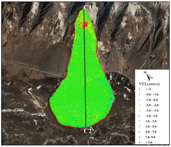 Figure 7 shows the location of the Luanshibao landslide, a large high-speed rock landslide, located on the northern margin of Maoyaba Basin. The maximum horizontal sliding distance is 3.83 km and the total landslide volume is 0.64 × 108 to 0.94 × 108 m3 [34]. The northwest section of the Litang fault passes through the middle of the landslide and influences the movement of this landslide [35]. At the same time, glacial movement may also lead to the destabilization of the landslide due to the high altitude in the area at the location of the landslide. Based on Figure 9, there is a notable displacement phenomenon at the back edge of the landslide. To examine the spatial displacement characteristics of the landslide, the elevation and displacement rate profiles of the landslide were extracted along the C1–C2 line (Figure 10). Based on the profile, the height difference of the landslide is approximately 900 m. The displacement rate along the back edge of the landslide is larger while the displacement rate of other areas is smaller, between 1 and 3 mm/year. This indicates that the back edge of the landslide is active.