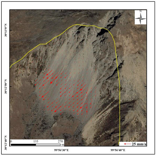 To study the displacement characteristics of the Luanshibao landslide in more depth, the displacement velocity field of the landslide’s back edge was calculated using the ascending and descending orbit InSAR monitoring results and DEM. Figure 11 shows the displacement velocity field at the rear edge of landslide. The results show that the displacement rate is more than 25 mm/a, and the direction of displacement indicates that the back edge is moving downward along the approximate slope. The bedrock of the slide bed at the back edge of the landslide is mostly exposed, and loose debris flow accumulation is formed on the middle and lower surface of the slope, which is nearly vertical in part. The tension unloading effect is strong, and the freeze–thaw weathering results in obvious displacement in the local area. The STR and National Highway 318 pass along the south side of the Luanshibao landslide, and relevant authorities should be aware of the threat posed by the landslide.