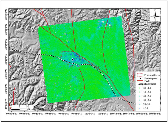 The active layer of the frozen soil area changes along with the seasons [29]. A difference of 9% between the volume of water and ice causes the surface to freeze and swell or thaw, which seriously endangers infrastructure in the frozen soil area [30,31,32]. Surface subsidence in the frozen soil area consists of two main components: periodic subsidence and uplift due to temperature changes and trend term subsidence. Periodic surface subsidence and uplift are mainly caused by periodic freezing and thawing of the active layer. In summer, the ice in the active layer melts, followed by surface subsidence. In winter, the water condenses back into ice, followed by uplift. Trend term subsidence is caused by the upward and downward movement of the permafrost layer’s upper limit. We note that frozen soil area subsidence does not always contain periodic and trend terms, but consists of one or both. We examined seasonal frozen soil areas dominated by seasonal subsidence and uplift. The pattern of change in the seasonal frozen soil area is equivalent to the amplitude of subsidence, where uplift is essentially the same, such that the seasonal frozen soil area can be identified based on this pattern.