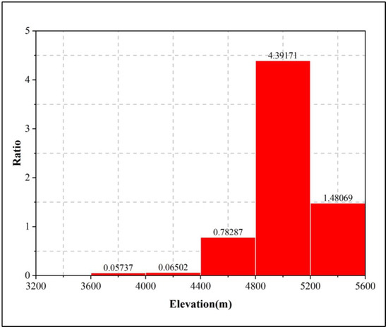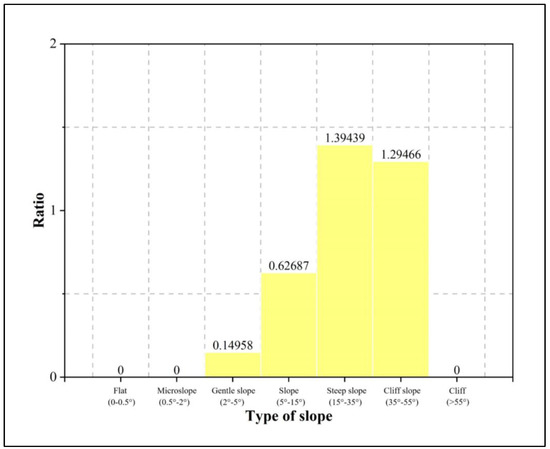 To determine the main factors affecting the spatial distribution of unstable slopes in the study area, elevation, slope, and fault zone were analyzed with their relationship to the unstable slopes. Figure 14 shows the ratio of the number of unstable slopes to the corresponding elevation area. The ratio gradually increases with an increase in elevation, and the ratio reaches its maximum in the interval of 4800–5200 m and then decreases. Therefore, elevation is a factor affecting the spatial distribution of unstable slopes. Figure 15 shows the ratio of the number of unstable slopes to the corresponding slope area. The statistical analysis showed that most of the unstable slopes are distributed on slopes of 5–55°. The reason for this phenomenon is that the low slope has no dynamic conditions for the occurrence of movement while a high slope is not conducive to the accumulation of materials. Additionally, the topographic slope affects rainfall and heat distribution and thereby influences slope vegetation cover.