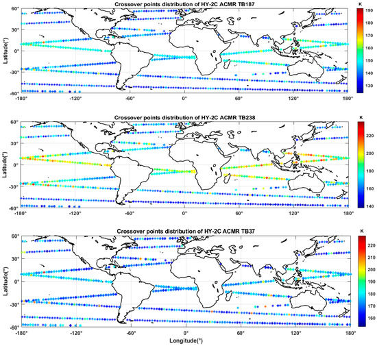 Through the analysis of Section 2, we can obtain the measured brightness temperature of HY-2C CMR. The major difficulty in evaluating the measured brightness temperature is to find a reference and the usage of crossover points from a pair of sensors is a common practice. The three-channel Jason-3 AMR-2 that operates at 18.7 GHz, 23.8 GHz and 34 GHz is generally regarded as an important reference for its high accuracy measurement of brightness temperatures, which has been fully calibrated. Thus, the quantitative evaluation of the measured brightness temperature of HY-2C CMR is performed by directly comparing it with the brightness temperatures of Jason-3 AMR-2.