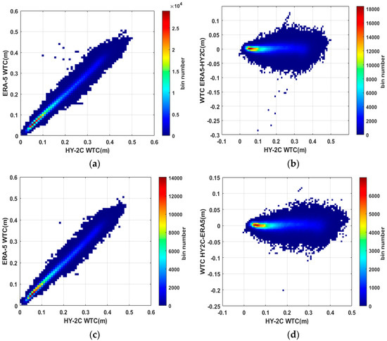 (a): HY-2C WTC versus ERA-5 WTC in algorithm database; (b): HY-2C WTC versus WTC difference between HY-2C and ERA-5 in algorithm database; (c): HY-2C WTC versus ERA-5 WTC in retrieval database; (d): HY-2C WTC versus WTC difference between HY-2C and ERA-5 in retrieval database.