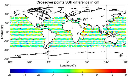 It is obvious that the accuracy of the SSH has a direct relationship with the accuracy of the WTC adopted to acquire the SSH [29]. Ideally, the change of SSH is negligible within a short period window, which means that the SSH differences derived at crossover points between the ascending and descending passes of a satellite would be approximately 0, any observed variability of SSH is caused by corrections. Thus, the standard deviation of the SSH differences at crossover points can be applied as a global metric for comparing different WTC retrieval methods. The main advantage of this method is that it does not require any other references and can evaluate the overall performance of the altimeter system. When comparing two WTC retrieval methods, the smaller standard deviation of SSH difference at crossover points indicates the better one.