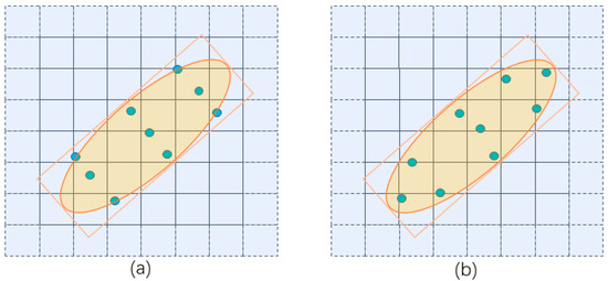 As shown in Figure 7a, we divide the RB-Box uniformly into a 28 × 28 grid, and the bins in it have the same size. The center points in these bins are selected as the feature sampling locations, . The bilinear interpolation algorithm is used to calculate the features at the with the four nearest feature points in . The feature sampling process can be described by Equation (4):