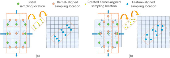 Secondly, the kernel-aligned sampling locations perform the rotation step and translation step to obtain the feature-aligned sampling locations. As shown in the middle and right figures of (a) and (b), the two kinds of kernel-aligned sampling locations are firstly rotated by the rotation angle () predicted by the R-Anchor branch and then transferred to the feature map coordinate system. The two kinds of feature-aligned sampling locations of RAConv and CAConv, and , can be obtained after these two steps. The calculation processes can be described by Equation (2):