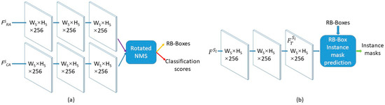 The DetHead and MaskHead are two output heads, as shown in Figure 6, that are both designed on the lightweight convolutional framework commonly used in various object-detection networks and instance-segmentation networks [10,13,16,28,31,32,36]. In (a), the DetHead contains two branches, the and , which are extracted by the DAM and taken as inputs to produce RB-Boxes based on and their classification scores. Then, based on the classification scores, the rotated NMS algorithm, in which the rotated IoU calculation algorithm is used, filters the RB-Boxes to remove the overlapping and redundant RB-Boxes and produces the final RB-Boxes and their corresponding classification scores. In (b), the MaskHead chooses a single-scale feature map, , from FPN according to the area of each RB-Box [4] and extracts the texture feature map, , with a fully convolutional network. Then, with , the instance masks in the final RB-Boxes are predicted by the RB-Box instance mask prediction as follows.