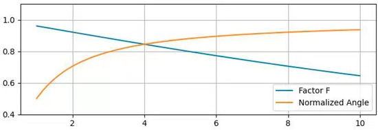 Illustration of the factor and the normalized angle with . The horizontal axis represents the aspect ratio. The vertical axis represents the value of the factor and the normalized angle.