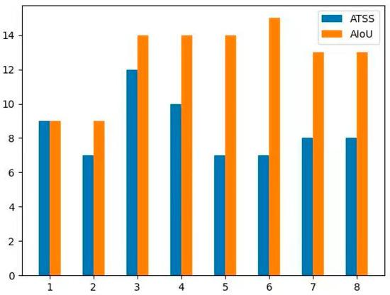 Illustration of the number of positive samples allocated by the ATSS and the AIoU. The horizontal axis represents the aspect ratio. The vertical axis represents the number of positive samples.
