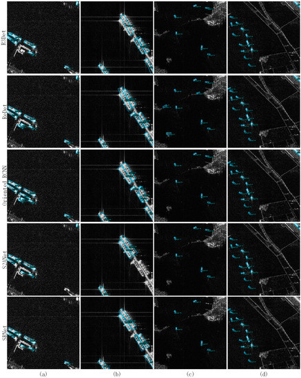 Figure 11 and Figure 12 show four visualization examples of all the comparison networks on the SSDD dataset and RSDD dataset, respectively. In Figure 11, (a) is the scene of a single ship berthing in a dock, (b) is the scene of parallel ships berthing in a dock, (c) is the scene of multiple parallel ships berthing in a dock, and (d) is the scene of multiple ships sailing in the water region. In Figure 12, (a) is the scene of the ships berthing on one side of a dock, (b) is the scene of the ships berthing on both sides of a dock, and (c) and (d) are the scene of ships sailing on the water region. From the two figures, we can see that the parallel berthing arrangement and the non-ship objects in the dock have a bad influence on the output RB-Boxes. For example, in Figure 11a–c and in Figure 12a,b, there are a large number of missing alarms and false alarms in the results of comparison networks. How to distinguish the different parallel ships is especially a hard barrier to all comparison networks, which predict the parallel ships to one single ship. Because of the interference of textures and shapes of isles or other ship-like objects, it is difficult for comparison networks to detect ships in the water region. In Figure 11d and Figure 12c,d, there are also a large number of missing alarms and false alarms in the results of comparison networks. However, in the results of our SRNet, for the scene of multiple parallel ships berthing in a dock, almost all the parallel ships can be distinguished by the SRNet, and the RB-Boxes almost have the accurate shapes and location, that can be seen in Figure 11a–c and Figure 12a,b. This is mainly because the DAM provides the representative features for regression so that the RB-Boxes can grasp the shapes and locations of ships. Moreover, allocating samples by the AIoU threshold makes the features at the bow and stern trained effectively, which helps distinguish the parallel ships. For the scene of multiple ships sailing in the water region, there are fewer missing alarms or false alarms in the results of the SRNet, and almost all RB-Boxes have the rational classification scores, which can be seen in Figure 11d and Figure 12c,d. This is mainly because the DAM in the SRNet can provide the representative features to produce accurate classification scores so that the ships can be accurately detected, and the docks can be distinguished.