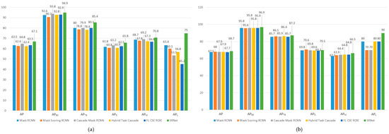 In instance-segmentation experiments, we use several metrics to evaluate the instance masks output from the instance-segmentation networks. These metrics are the APs under the conditions of different instance mask IoUs [43], which are in MS COCO format [43] and can evaluate instance-segmentation performance comprehensively [19]. To evaluate the performance of instance segmentation under different overlap ratios, three APs are used in this paper. AP is the most important metric which is under the condition of the IoU thresholds in the range of 0.5 to 0.95. AP50 and AP75 are under the conditions of the IoU thresholds of 0.5 and 0.75, respectively. It is worth noting that the higher the IoU threshold is, the more strictly the predicted instance mask is required to match the ground truth mask. To evaluate the performance of instance masks for the objects with different scales, respectively, APS, APM, and APL are used, which are calculated under the condition of IoU threshold equal to 0.5. APS calculates the AP value for the object with a small scale (area of object < 322 pixels), APM calculates the AP value for the object with a medium scale (322 pixels < area of object < 962 pixels), and APS calculates the AP value for the object with a large scale (962 pixels < area of object) [43]. In experiments, these evaluation metrics can comprehensively evaluate the instance-segmentation performance of networks.