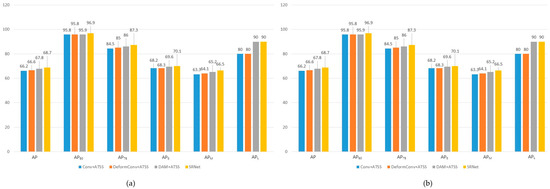 From the two histograms in Figure 16, we can see that almost all the metrics of SRNet are higher than those metrics of DAM+ATSS, thus illustrating that by training the network with the AIoU calculation method, more rational positive samples are used to effectively train the network so that the performance can be improved. From the metrics of Conv+ATSS, DeformConv+ATSS, and DAM+ATSS, we can see that almost all the metrics of DAM+ATSS are higher than others. It indicates that, without training the network with the AIoU calculation method, the DAM+ATSS still achieves a higher performance than other networks with standard convolution and deformable convolution, respectively. However, the APL of DAM+ATSS on the SSDD dataset is lower than others, which means that the DAM cannot be trained effectively with the positive samples of large ships obtained by ATSS. In addition, the high metrics of DAM+ATSS illustrate that by considering the difference between the regression task and classification task, the DAM can improve the performance a lot.
