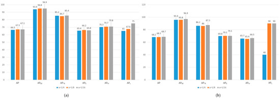 To verify the rationality of the value of factor α, the ablation experiments with different values of α were conducted on the SSDD dataset and Instance-RSDD dataset. As shown in Table 7 and Table 8, the value of α is set to 1/4, 1/8, and 1/16. Take the network with α of 1/4 as the baseline, and with the α decreasing, the performance of the network raise. To enhance the visualization of the two tables, their corresponding histograms are shown in Figure 17. From the two histograms, we can see that almost all the metrics columns of α = 1/16 are higher than those columns of other α settings. The metrics APL especially increase obviously. Thus, our parameter setting, α = 1/16, is reasonable.