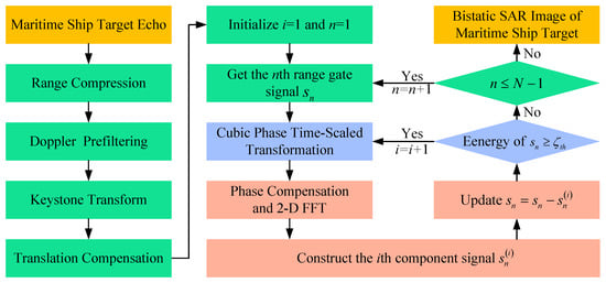 Based on the estimation results of Doppler parameter in Section 3.2, a bistatic SAR maritime ship target imaging method based on cubic phase time-scaled transformation is established, and its detailed flow is illustrated in the Figure 2. The main procedure is as follows: