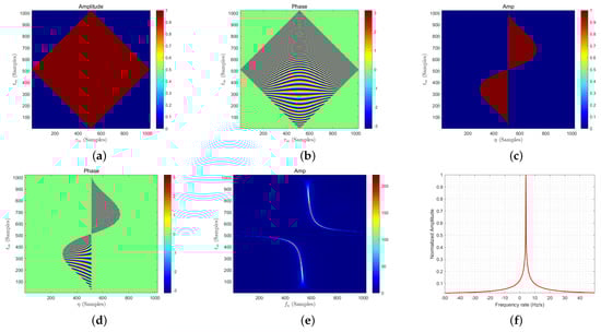 Results of a noise—free mono—CPS. (a) Amplitude of . (b) Phase of . (c) Amplitude of in domain. (d) Phase of in domain. (e) Amplitude of in domain. (f) Searching result of .