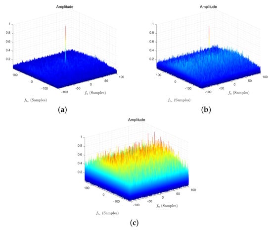 Next, a mono-CPS with Gaussian noise condition is considered, and we set the signal-to-noise rate (SNR) to −5 dB, −7 dB, and −10 dB, respectively. Figure 5a–c shows a stereogram of the final focusing result using the SCFT-based algorithm [] under −5 dB, −7 dB, and −10 dB of SNR. It can be seen from Figure 5a–c, that the CPS is obviously submerged in noise due to the fourth-order nonlinearity of its algorithm. Figure 6a–c shows the stereogram of the final focusing result by the proposed algorithm under −5 dB, −7 dB, and −10 dB of SNR. As shown in Figure 6a–c, the CPS can still be finely focused. Clearly, it can be seen that the proposed algorithm has a better noise immunity than the SCFT-based algorithm.