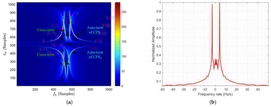 Next, the parameter estimation of multi-component CPS is simulated and analyzed. We consider noise-free CPS and CPS in the Table 1. With the FFT operation along -axis of , Figure 7a gives the time-frequency distribution of CPS and . As shown in Figure 7, the two-dimensional time-frequency distribution results contain the auto-term and cross-term, and it can be seen from in (36) that the auto-term is rectangular hyperbola in the domain, while the cross-term is a curved curve, as shown in Figure 7a.