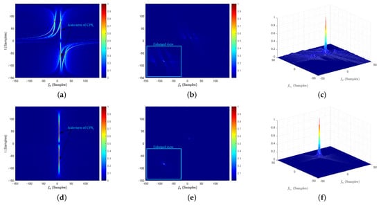 By searching the , the results are shown in Figure 7b. The searched coefficients are used to compensate the cubic phase time-scaled signal. The auto-term of the compensated signal becomes two straight lines in the domain and is symmetric about the axis. The other cross-terms are still scattered in the form of curves, as shown in Figure 8a. Then, through phase compensation and FFT processing along -axis, the two lines of the auto-term are accumulated into a peak, so that the CPS signal can be accurately focused in the two-dimensional frequency domain, as shown in Figure 8b. In order to highlight the details, the lower left corner with a cyan border is a partial enlarged view at the peak location. As for the cross-term, because it is scattered in the two-dimensional time-frequency domain and is not symmetrical about , the cross-term cannot achieve effective accumulation in the two-dimensional frequency domain. The accumulation result of the CPS is shown in Figure 8b,c. After removing the CPS signal with CLEAN technology [], the results of phase compensation and FFT processing on CPS are shown in Figure 8d–f. As shown in Figure 8d, the signal energy of CPS has been basically removed, and the auto-term has become two straight lines after compensating the second-order term coefficient and FFT along the direction of . Then, through phase compensation and FFT processing along -axis, the two lines of the auto-term are accumulated into a peak, so that the CPS can be accurately focused in the two-dimensional frequency domain, as shown in Figure 8e,f.