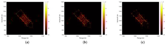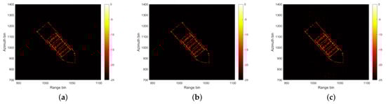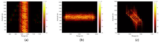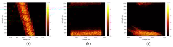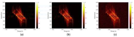 Maritime ship target imaging results obtained by the SCFT−based algorithm []. (a) SNR = 0 dB. (b) SNR = −5 dB. (c) SNR = −10 dB.