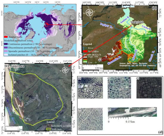 Location of the study area in Saskylakh, northwestern Yakutia, Russia. (a) Global permafrost distribution and study area location, Saskylakh, Anabarsky District, the Sakha Republic, Russia (URL: https://climate.esa.int/en/projects/permafrost/, accessed on 27 February 2023) cited from [28]; (b) Location of the study area in the Anabar basin (URL: https://www.hydrosheds.org/, accessed on 27 February 2023); (c) Study area image (the background image is a Google Earth image, accessed in August 2013); the yellow line is the study boundary; and (d) The representative examples of different IWPs. Insets (1) to (4) are the representative sample from Google earth images of LCP (1–2) and HCP (3–4) in the study area; and inset (5) is the representative sample of Google Earth images for the Saskylakh Aeroport.