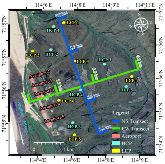 According to the widely accepted classification method [34,35], Saskylakh has both low-centered polygons (LCPs) and high-centered polygons (HCPs). LCPs are generally found in flat areas with surficial peat accumulation and commences to grow as incipient polygons. However, with the gradual accumulation of peat and the displacement of material by the growing wedge ice, ridges usually develop parallel to the sides of the ice-wedge troughs. HCPs result from the lowering of the water level in the ice-wedge troughs of intermediate-centered polygons to leave domed areas above the troughs [36]. The study area is dominated by LCPs and HCPs, mosaicked by a relatively small proportion of thermokarst lakes and ponds, as well as lower-lying drainage channels with lusher vegetation. The Saskylakh Aeroport (61 m a. s. l., with a runway length of 1800 m) is the objective of the comparative study for their engineering or other anthropogenic disturbances.