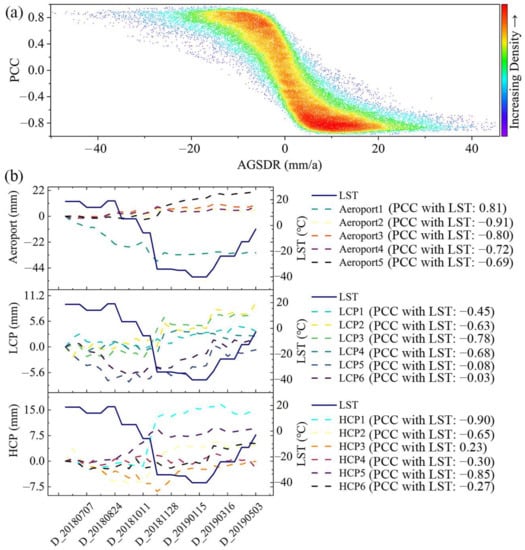 In general, the PCC(GSD and LST) is larger for points with larger AGSDR, and the PCC(GSD and LST) uncertainty is larger for AGSDR in −10~10 mm/a. The PCC(GSD and LST) is positive for points with negative AGSDR and negative for points with positive AGSDR (Figure 5a).